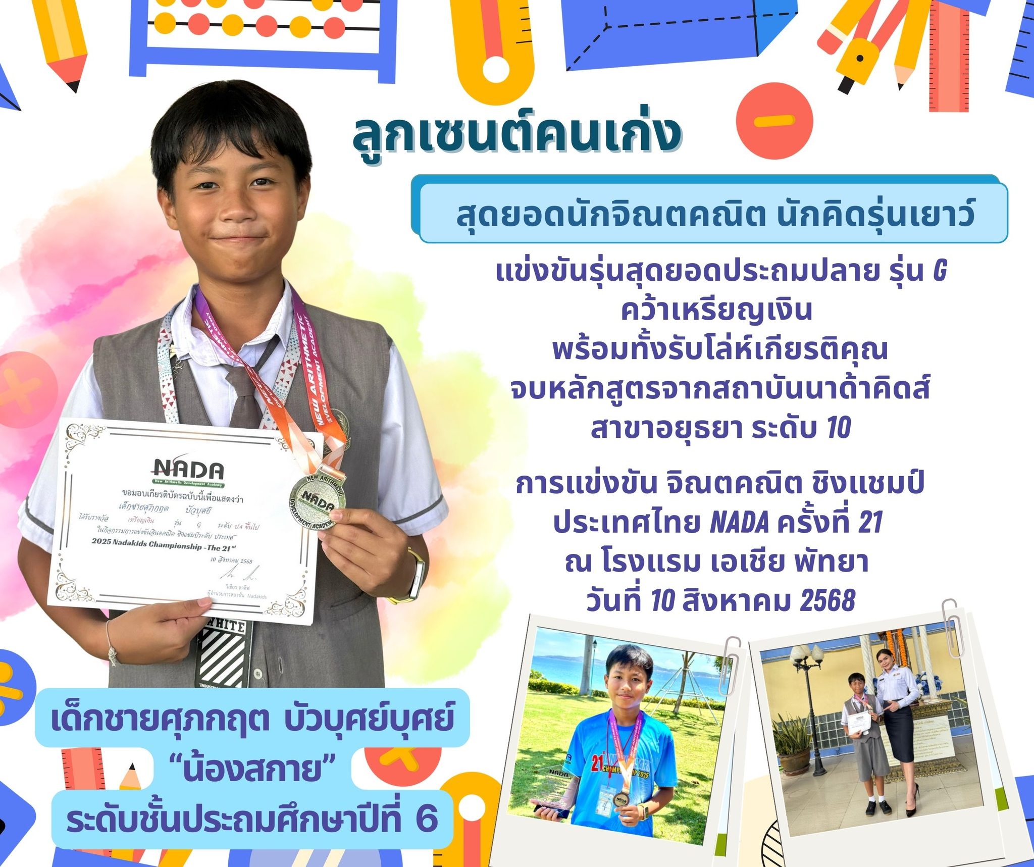 ลูกเซนต์คนเก่ง สุดยอดนักจิณตคณิต นักคิดรุ่นเยาว์ เด็กชายศุภกฤต บัวบุศย์ นักเรียนชั้นประถมศึกษาปีที่ 6