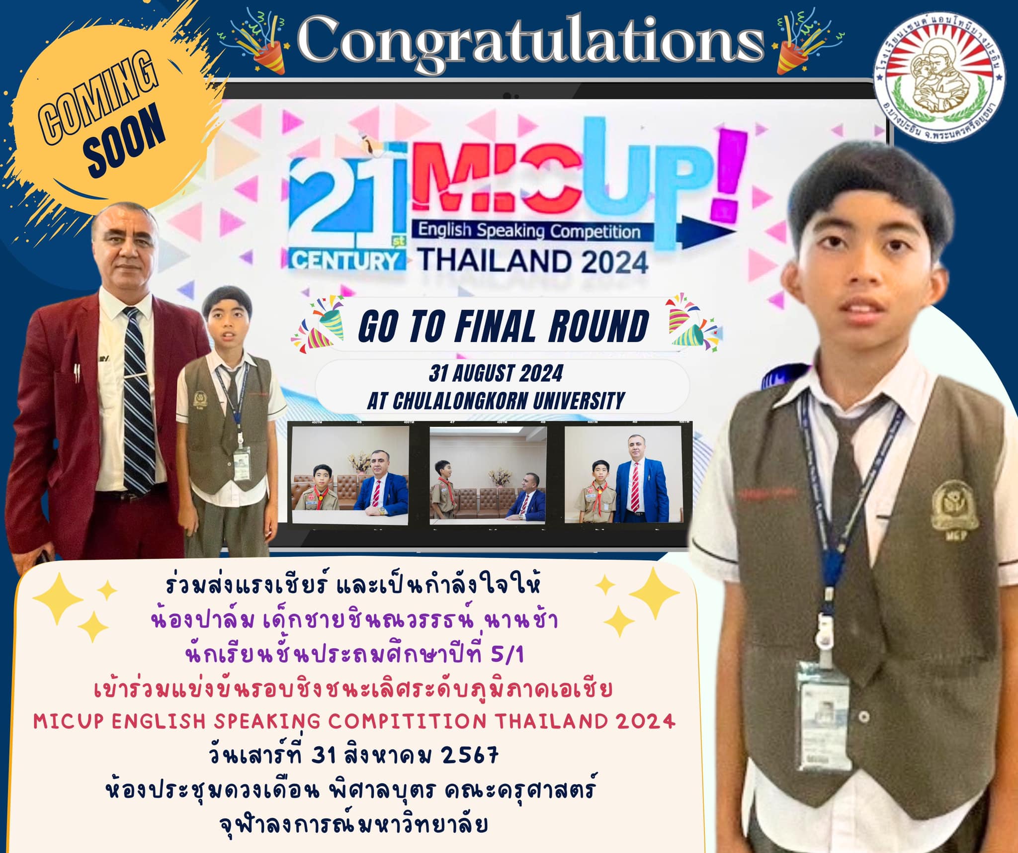 เด็กชายชินณวรรธน์ นานช้า​ นักเรียนชั้นประถมศึกษาปีที่ 5/1 ที่ได้ผ่านการแข่งขันจากรอบ Semi- Final ในรายการ MicUp English Speaking Compitition Thailand 2024 เมื่อวันที่ 15 กรกฎาคม 2567 เข้าสู่รอบ Final รอบชิงชนะเลิศ
