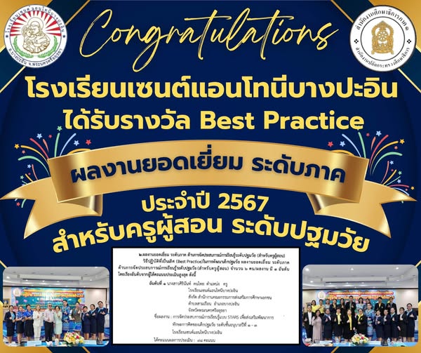 โรงเรียนเซนต์แอนโทนีบางปะอิน ได้รับรางวัล #ผลงานยอดเยี่ยม #ระดับภาค ประจำปี 2567 Best Practice สำหรับครูผู้สอน ด้านการจัดประสบการณ์การเรียนรู้ระดับปฐมวัย นำเสนอผลงานโดย คุณครูศิรินันท์ คนไทย คุณครูระดับปฐมวัย
