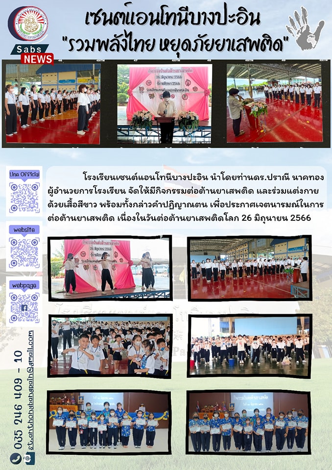 วันที่ 26 มิถุนายน 2566 โรงเรียนเซนต์แอนโทนีบางปะอิน นำโดยท่าน ดร.ปราณี นาคทอง คณะผู้บริหาร ครู และบุคลากร ได้จัดกิจกรรมวันต่อต้านยาเสพติดห้องเรียนสีขาวขึ้น ภายในงานมีการอ่านสารของรัฐมนตรีว่าการกระทรวงศึกษาธิการ นางสาวตรีนุช เทียนทอง กล่าวคำปฏิญาณตนประกาศเจตนารมณ์ในการต่อต้านยาเสพติด และร่วมกันเต้นแอโรบิค