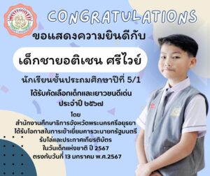 เด็กชายอติเชน ศรีไวย์ ที่ได้รับคัดเลือกเป็นเด็กและเยาวชนดีเด่น ประจำปึ 2567