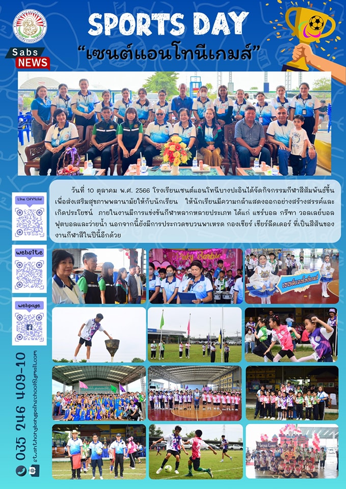 วันที่ 10 ตุลาคม พ.ศ.2566 โรงเรียนเซนต์แอนโทนีบางปะอินได้จัดกิจกรรมกีฬาสีสัมพันธ์ “เซนต์แอนโทนีเกมส์” ขึ้น ภายในงานมีการแข่งขันแชร์บอล กรีฑา วอลเลย์บอล ฟุตบอล และว่ายน้ำ นอกจากนี้ยังมีการประกวดขบวนพาเหรด กองเชียร์ เชียร์ลีดเดอร์ที่เป็นสีสันของงานกีฬาสีปีนี้อีกด้วย