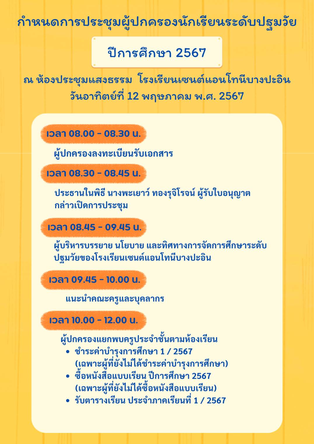 ขอเชิญประชุมผู้ปกครองนักเรียนโรงเรียนเซนต์แอนโทนีบางปะอิน
